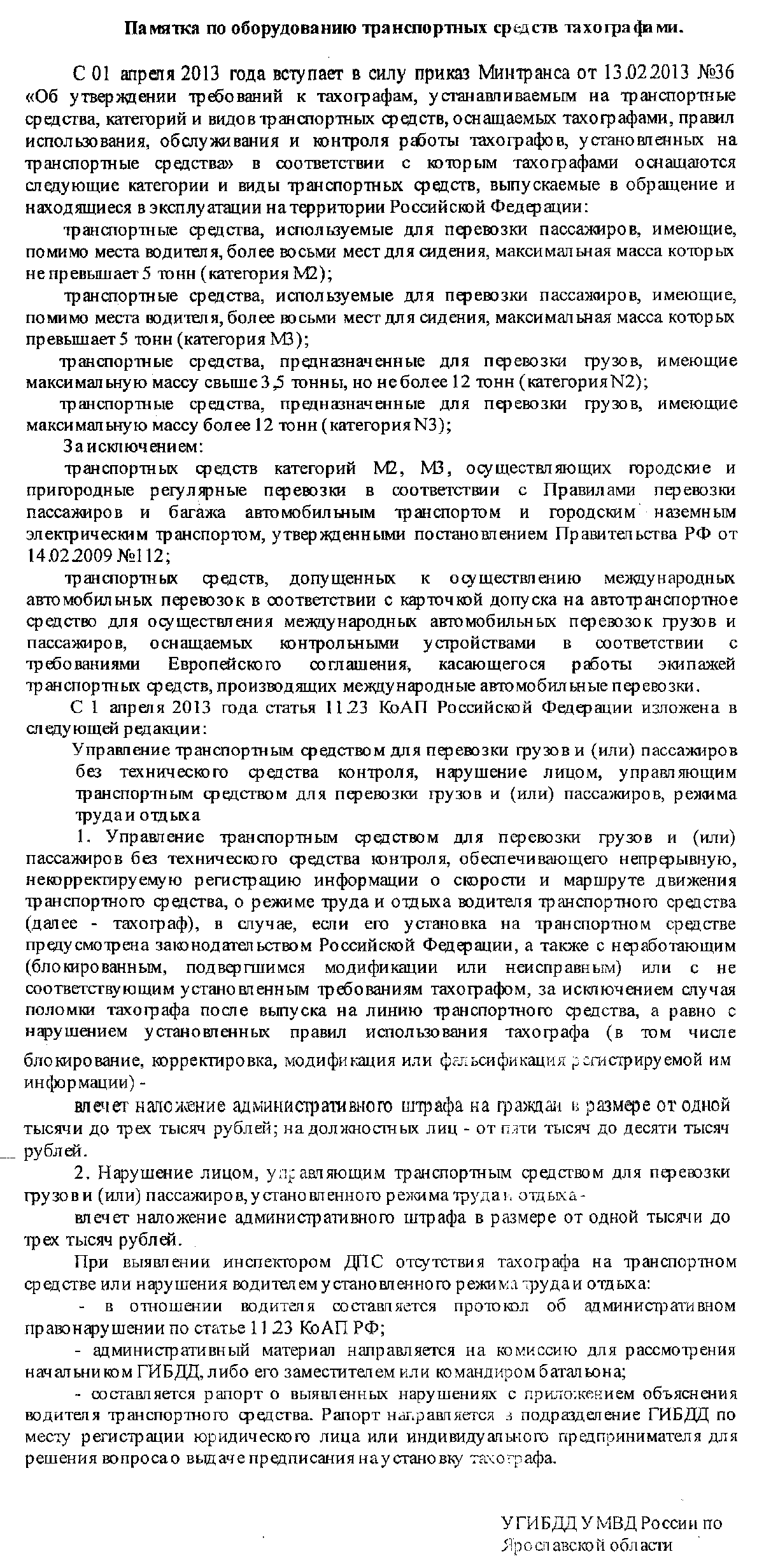 ГИБДДС 01 апреля 2013 года вступили в силу изменения, внесенные Федеральным Законом от 14.06.2012 года в статью 20 Федерального Закона от 10.12.1995 № 196-ФЗ «О безопасности дорожного движения», в соответствии с которыми юридические лица и индивидуальные предприниматели должны оснащать транспортные средства тахографами.В соответствии с приложением № 2 к указанному приказу Минтранса от 13 февраля 2013 года № 36 «Об утверждении требований к тахографам, устанавливаемым на транспортные средства, категорий и видов транспортных средств, оснащаемых тахографами, правил использования, обслуживания и контроля работы тахографов, установленных на транспортные средства» тахографами оснащаются следующие категории и виды транспортных средств, выпускаемые в обращение и находящиеся в эксплуатации на территории Российской Федерации: - транспортные средства, используемые для перевозки пассажиров, имеющие помимо места водителя, более восьми мест для сидения, максимальная масса которых не превышает 5 тонн (категория М2); - транспортные средства, используемые для перевозки пассажиров, имеющие помимо места водителя, более восьми мест для сидения, максимальная масса которых превышает 5 тонн (категория М3); - транспортные средства, предназначенные для перевозки грузов, имеющие максимальную массу свыше 3,5 тонны, но не более 12 тонн (категория N2); - транспортные средства, предназначенные для перевозки грузов, имеющие максимальную массу более 12 тонн (категория N3); Исключение составляют транспортные средства категории М2, М3, осуществляющие городские и пригородные регулярные перевозки в соответствии с Правилами перевозок пассажиров и багажа автомобильным транспортом и городским наземным электрическим транспортом, утвержденными постановлением Правительства Российской Федерации от 14 февраля2009 г. № 112. С 01 апреля 2013 года статьей 11.23 КоАП РФ установлена административная ответственность за управление транспортным средством с нарушением правил использования тахографов, а также режимов труда и отдыха водителей. Памятка по оборудованию транспортных средств тахографами Дата изменения: 02.04.2013 10:19:03 |