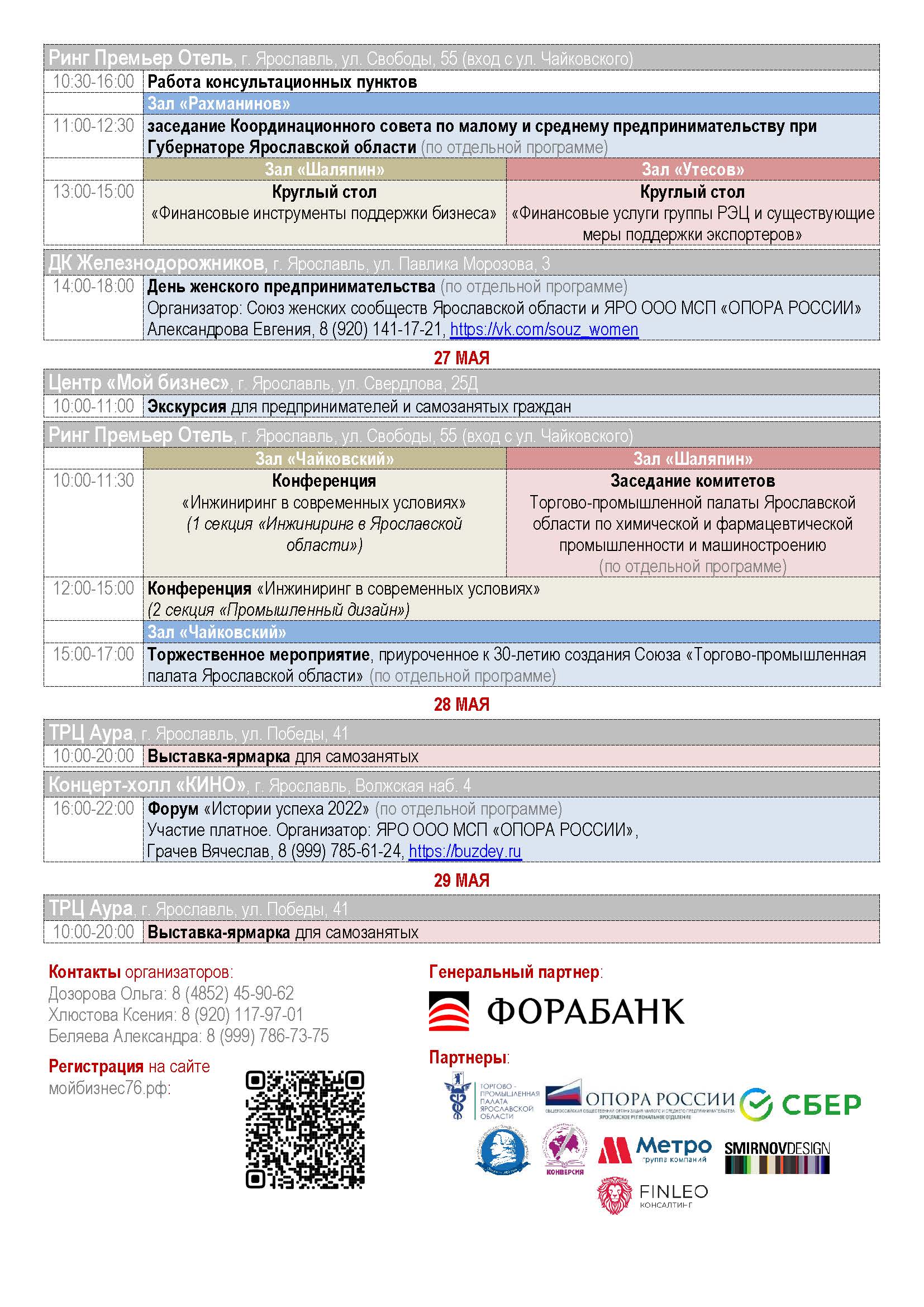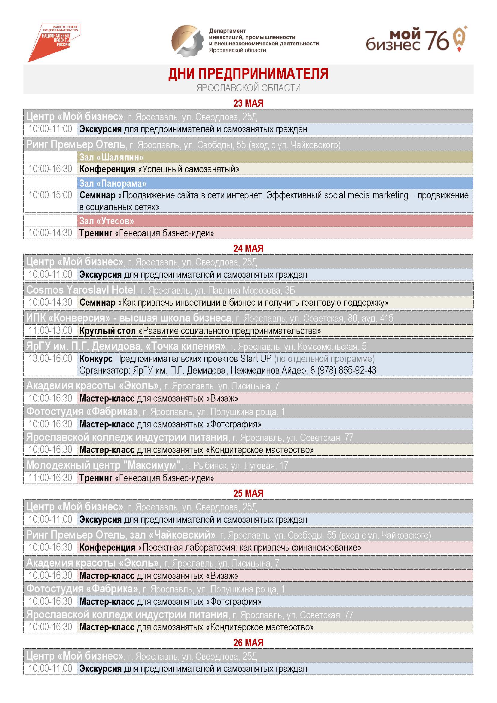 В рамках реализации национального проекта «Малое и среднее предпринимательство и поддержка индивидуальной предпринимательской инициативы» департаментом инвестиций, промышленности и внешнеэкономической деятельности Ярославской области с 23 по 29 мая 2022 года запланировано проведение Дней предпринимателя Ярославской области, включающих в себя более 20 мероприятий для субъектов малого и среднего предпринимательства, в том числе социальных и экспортно ориентированных предприятий, а также самозанятых граждан региона. Регистрация на мероприятия осуществляется на сайте Центра «Мой бизнес» Ярославской области в календарном плане мероприятий по ссылке: https://мойбизнес76.рф/events. Телефон для справок: 8 (4852) 594-754. ![]()